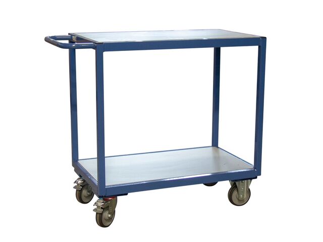 Servante établi 2 plateaux aux dimensions 850 x 500 mm ou 1000 x 600 mm idéale pour une utilisation intensive. Robuste et fonctionnelle grâce à son châssis résistant en acier entièrement mécano soudé. La construction du châssis est en tube carré de 30 x 30 mm. Elle est équipée d'une poignée de poussée horizontale permettant de positionner des charges débordantes du plateau. La poignée est à hauteur ergonomique de 880 ou 915 mm limitant ainsi les TMS est en tube de Ø de 25 mm mécano soudé offrant une bonne prise en main. Plateaux mélaminés gris clair d'épaisseur 16 mm avec barre de renfort sous chaque plateau. Qualité de roulage irréprochable avec le bandage TPE, silencieux, non tachant, et absorbant les vibrations. Ses 4 roues Ø 125 ou 160 mm, montées sur roulement à billes étanche, sont conformes à la norme EN 1757. 2 roues fixes + 2 pivotantes à frein garantissant maniabilité et fiabilité lors de transport de charges. Effort au démarrage très réduit de près de 50%, soit
