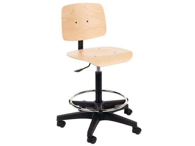 Siège d'atelier haut, type de piétement: central, assise matériau: bois multiplis, dossier: oui, repose-pieds: oui, assise hauteur mini: 530 mm, assise hauteur maxi: 780 mm, coloris: hêtre, siège modèle: haut, piétement matériau: nylon, type de pied: patins, assise matériaux: bois, produit recyclé: 47 %, approche éco-responsable: oui