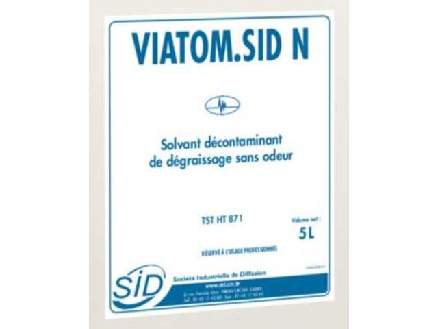VIATOM.SID N est destiné aux CENTRALES NUCLEAIRES, THERMIQUES et HYDRAULIQUES ainsi qu'à tous les services EDF et sous-traitants concernés directement ou indirectement par la procédure PMUC. VIATOM.SID N est un solvant de sécurité, classé ininflammable, utilisable en dégraissage et décontamination dans les centrales nucléaire. (sols, piscines, château de plomb, moteurs et pièces mécaniques ...) VIATOM.SID N ne laisse aucun résidu après évaporation sur les supports traités; le séchage instantané s'obtient à l'aide d'air comprimé sec et déshuilé.