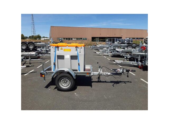 Station Easy Mobil 600 litres avec pompe Cematic 3000 12 V et Capot de protection sur remorque routière conforme ADR. Pour le ravitaillement sur les chantiers : Remorque routière homologuée CE simple essieu équipée. Freinée. Construction en acier galvanisé. Roue jockey télescopique escamotable. Timon articulé réglable en hauteur avec anneau (si attelage boîte à rotule souhaité, le préciser à la commande). Remorque avec signalisation et éclairage (12 V), homologuée Code de la route. Béquille AR coulissante. Capot de protection. Pompe Cematic 3000 12 V. - Débit 45 l/min. Sangles d'arrimage. Ravitaillement de la cuve par pistolet automatique.