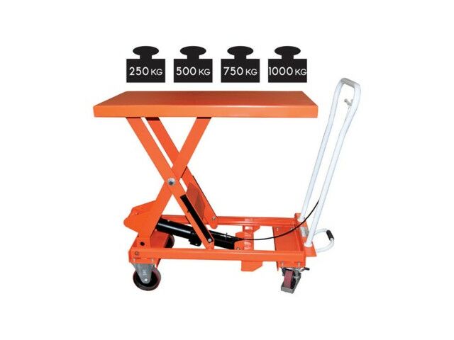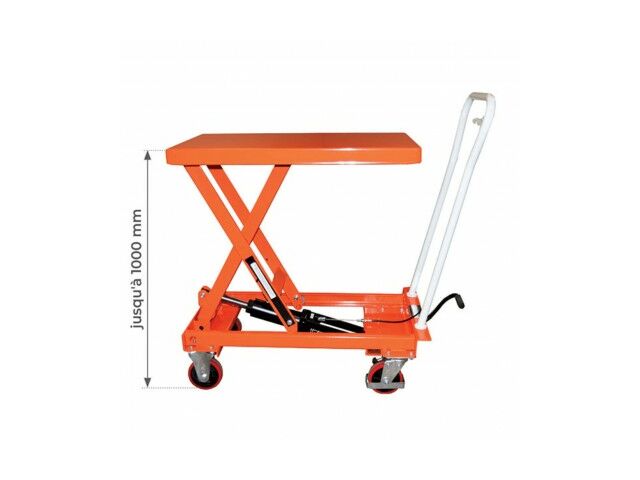 Table élévatrice manuelle haute qualité industrielle avec plateau et timon repliables. Adaptée pour le déplacement et la mise à niveau de charges de 150 kg à 1 tonne. Équipée de 2 roues fixes et 2 roues pivotantes avec frein. Table en acier et peinture époxy résistante aux rayures. Les + du produit :Garantie 3 ansAvec timon repliableAdaptée contre les troubles musclo-squelettiques (TMS)Matériel industriel haut de gamme, garantie 100% qualité premiumTable en acier, peinture époxy résistanteLevée de plateau commandée par pédaleDescente proportionnelle par manette située en haut de l'arceau de pousséeÉquipée de deux roues fixes et deux roues pivotantes avec frein Dimensions : 950 x 450 x 1000 mm à 1260 x 520 x 1130 mmPoids : 40 à 128 kg