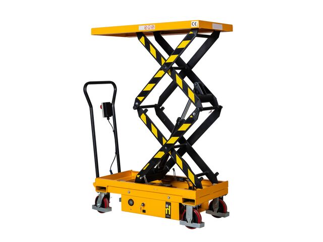 Table élévatrice mobile semi-électrique, idéale pour la mise à niveau de vos charges.Conçue pour supporter des charges lourdes, elle offre une capacité maximale de 300 ou 500 kg selon la référence.Le déplacement de la table se fait manuellement, tandis que l’élévation est assurée de manière électrique, permettant de réduire l’effort physique et de gagner en efficacité. La commande électrique de la table élévatrice mobile se situe sur l'arceau de poussée, facilitant ainsi la mise à niveau des charges à la hauteur de travail souhaitée. Elle est dotée d’un large plateau de 1010 x 520 mm, vous offrant une plateforme stable et spacieuse pour accueillir différents types de charges, comme des palettes ou autres matériaux volumineux.Sa structure en acier robuste, protégée par une peinture époxy, résiste efficacement aux chocs et aux marques liés à une utilisation quotidienne intensive.Les roues en acier, recouvertes de polyuréthane haute résistance, assurent une excellente maniabilité tout en garantissant un déplacement silencieux. Equipée de deux roues fixes à l’avant et de deux roues pivotantes à l’arrière, facilitant ainsi les manœuvres dans tout type de poste de travail.Enfin, elle est équipée d’un bouton d’arrêt d’urgence, et contribue à prévenir les troubles musculosquelettiques (TMS).Elle est également intégrée avec une batterie rechargeable de "12V / 70Ah" et d'un chargeur, situés sous le châssis de l'appareil, permettant une autonomie de fonctionnement de 5 à 10 cycles par heure, soit jusqu'à 8 heures de travail continu sans interruption. Caractéristiques techniques : Capacité de levage (kg) : 300 ou 500 Hauteur d'élévation maximale (mm) : 1618 Haut totale (mm) : 1095 Dimensions des roues directrices (mm) : 125 x 40 Course de levage (mm) : 1080 Batterie (v/Ah) : 12V/70Ah Dimensions de la table (mm) : 1010 x 520 Épaisseur du plateau (mm) : 53 Haut. min. (mm) : 495 Haut. manche (mm) : 850 Coloris : RAL 1028 À découvrir aussi : notre large gamme de chariots, gerbeurs, nacelles et autres appareils de levage qui vous permettront de faciliter vos déplacements de charges. Pour une solution de levage encore plus ergonomique, explorez nos transpalettes manuels et transpalettes électriques adaptés à tous vos besoins de manutention.