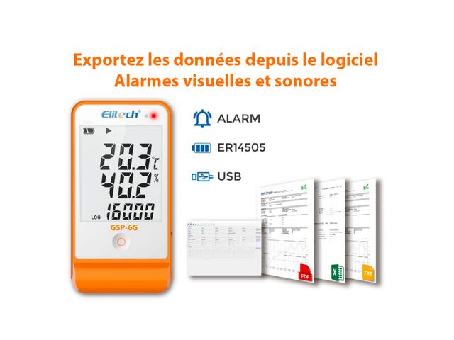 Définissez des seuils d'alarme personnalisés pour la température et l'humidité. Lorsque ces seuils sont dépassés, l'enregistreur émet des alertes visuelles et sonores pour vous avertir instantanément, vous permettant de réagir rapidement. Tout est paramétrable via le logiciel gratuit ElitechLog.