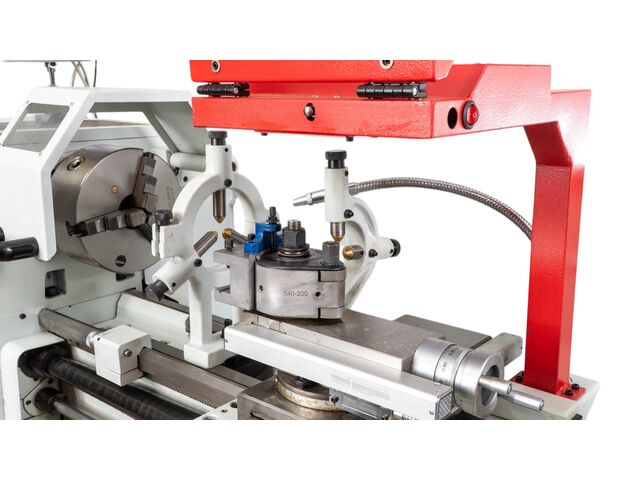 Tour à métaux complet avec une transmission à engrenages dans un bain d'huile, équippé d'une base en fonte, éclairage LED, système de refroidissement, moteur puissant triphasé 400V de 2,2 kW et lecture digitale sur 3 axes.