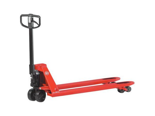 Transpalette manuel à frein, force: 3000 kg, fourche longueur: 1150 mm, type de roue de fourche: double, roue directrice matériau: polyuréthane, roue de fourche matériau: polyuréthane, roue de fourche ø: 85 mm, roue de fourche largeur: 75 mm, fourches écartement ext.: 520 mm, roue directrice ø: 175 mm, roue directrice largeur: 60 mm, hauteur de levée mini: 85 mm, hauteur de levée maxi: 200 mm, angle de braquage: 180 °, emballage recyclé: 50 %, modèle: avec frein de parking à main, ce: oui