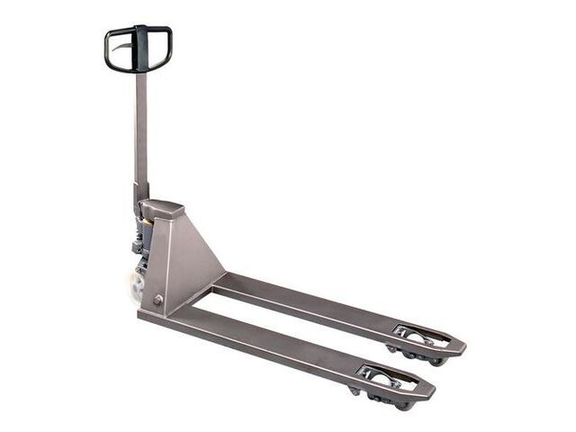 Transpalette manuel inox, force: 2000 kg, fourche longueur: 1150 mm, type de roue de fourche: simple, roue directrice matériau: nylon, roue de fourche matériau: nylon, roue de fourche ø: 85 mm, fourches écartement ext.: 520 mm, roue directrice ø: 175 mm, roue directrice largeur: 60 mm, poids du produit: 65 kg, distance entre fourches: 200 mm, hauteur de levée mini: 85 mm, hauteur de levée maxi: 200 mm, angle de braquage: 180 °, hauteur hors tout: 1220 mm, longueur hors tout: 1510 mm, emballage recyclé: 50 %, modèle: inox, fourche largeur: 156 mm