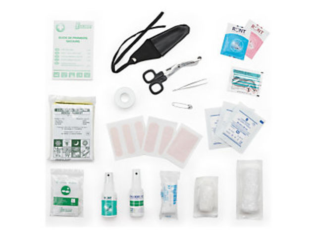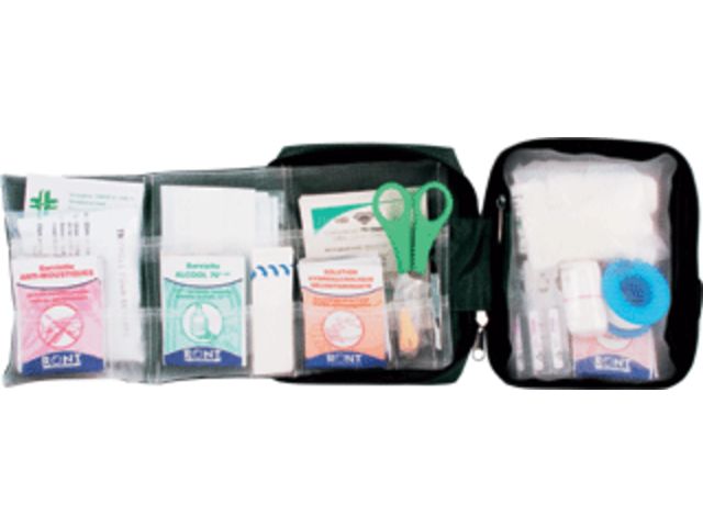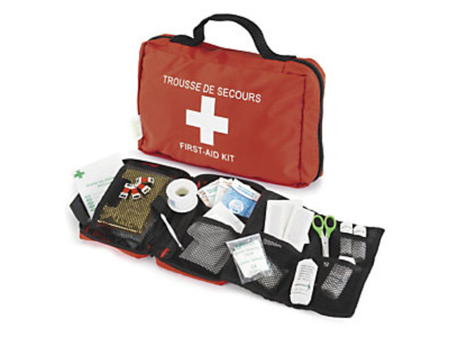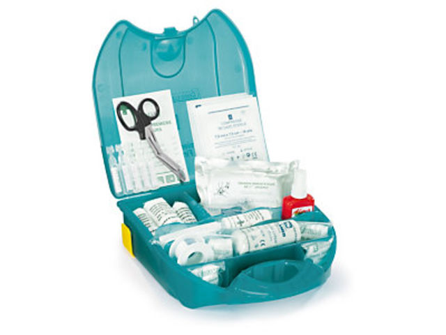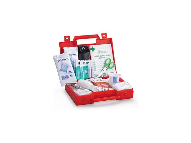 Trousse de secours en polypropylène rougeContenu:1 couverture de survie10 compresses stériles2 bandes extensibles2 pansements compressifs stériles1 rouleau de sparadrap5 compresses anti-coups5 compresses alcoolisées5 compresses antiseptiques2 unidoses 5ml pour lavage oculaire18 pansements adhésifs1 paire de ciseaux1 pince à échardes1 doigtier12 épingles de sureté2 paires de gants vinyle1 guide de premiers secours en 6 langues.Obligatoire dans tous les lieux de travail selon l'article R 4224-14 du code du travail.