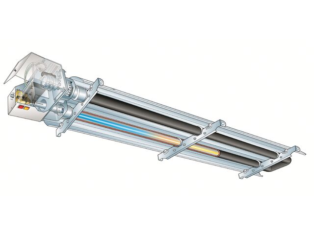 Tube radiant gaz en épingle pour bâtiments industriels de moyenne et grande hauteur, avec ou sans isolation.