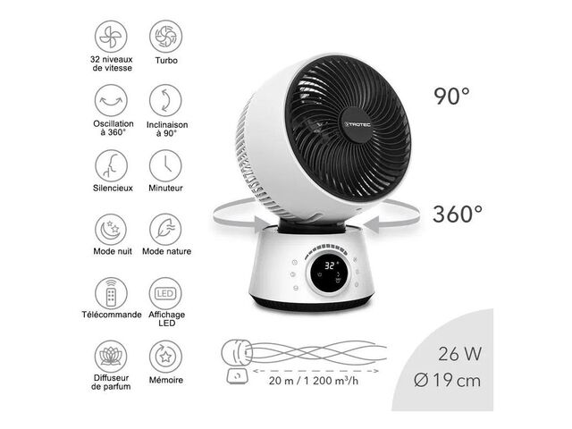Ventilateur 3 en 1 pour le brassage de l’air avec diffuseur d'arôme, fonction rotation/inclinaison brevetée et technologie Turbospin. La fraîcheur, le bien-être et le confort pour les connaisseurs. Faites fleurir le climat ambiant ! Aussi impressionnant sur le plan optique que sur le plan technique, le ventilateur turbo TVE 100 combine le design visionnaire de l’ère « Space Age » avec la technologie Turbospin la plus moderne. Et avec les atouts de fonctions d’amélioration de l’air ambiant pour plus de confort et de bien-être au travail comme à la maison. Le cœur du TVE 100 est constitué par un moteur haut régime de 26 Watt et une hélice tripale qui permet de compresser l’air ambiant aspiré à l’arrière et de le transformer en un flux d’air rafraîchissant pouvant être projeté jusqu’à 20 mètres. L’aérodynamisme des lamelles de sortie d’air de la tête sphérique permet de projeter et de faire tourbillonner l’air dans la pièce à l’un des 32 niveaux de ventilation…