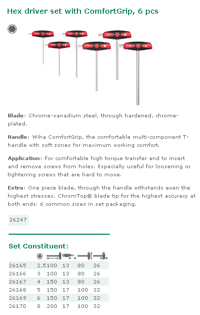 Jeu de pièces : 6 pièces Lame : Acier chrome-vanadium, entièrement trempé, chromé Poignée : Wiha ComfortGrip, T-handle multi-composant avec zones souples Utilisation : Transfert de couple élevé confortable et insertion/retrait de vis Spécialité : Désertissage ou serrage de vis difficiles à bouger Extra : Lame monobloc traversant la poignée pour résister aux contraintes les plus élevées Précision : Pointe ChromTop® pour une précision maximale aux deux extrémités Tailles courantes : Inclus dans un packaging de 2 pièces