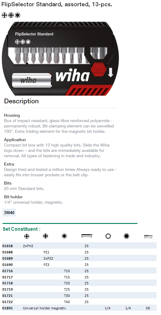 Nombre d'embouts: 13 Taille des embouts: 25 mm Type d'embout: Standard Porte-embout: 1/4" universel, magnétique Matériau du boîtier: Polyamide renforcé de fibre de verre Réf. fournisseur: 01895 Marque: Wiha Gamme: FlipSelector Standard