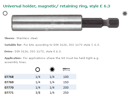 Sur le plan technique, ce porte-embout universel de type E6.3 mesure 40mm de long et pèse 100g. Il est compatible à la fois avec les embouts DIN 3126 et ISO 1173 de style C 6.3, offrant une grande variabilité d’utilisation. Sa fonction de conduite se fait également selon les normes DIN 3126, 150 1173, de style € 6.3.