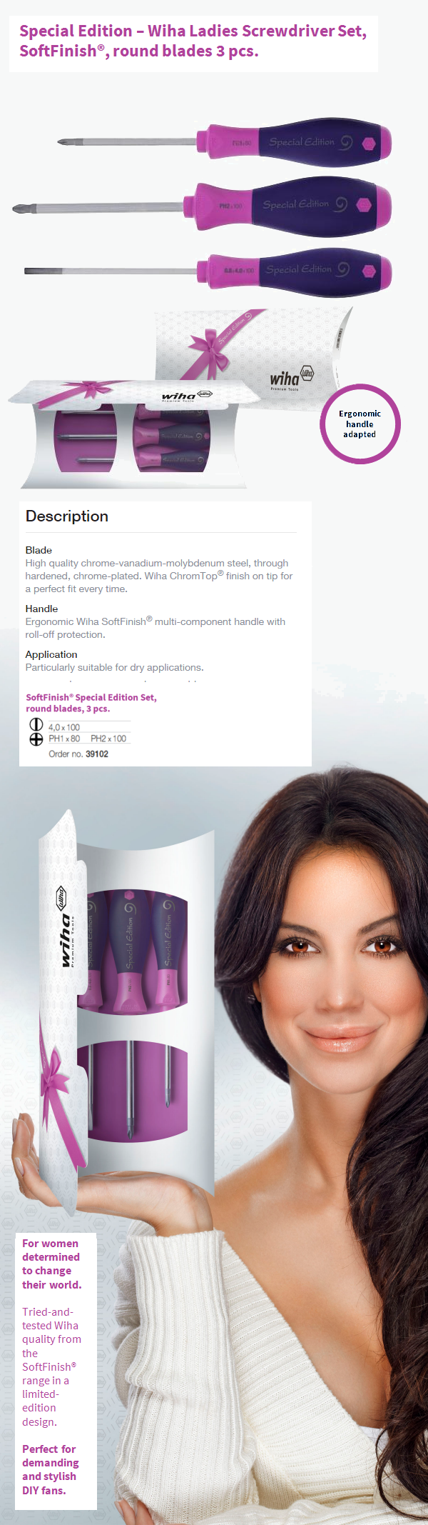 Marque : Wiha. Modèle : Ladies Line. Nombre de tournevis : 3. Type de fentes : Phillips. Manches : SoftFinish. Lames : Rondes. Matériau des lames : Acier chromé-molybdène. Longueur des lames : 75 mm. Poids : 100 g.